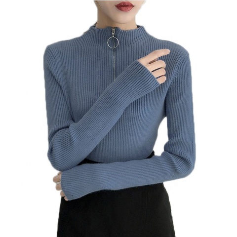 Metade de gola alta manga longa de malha pullover camisola de malha das mulheres